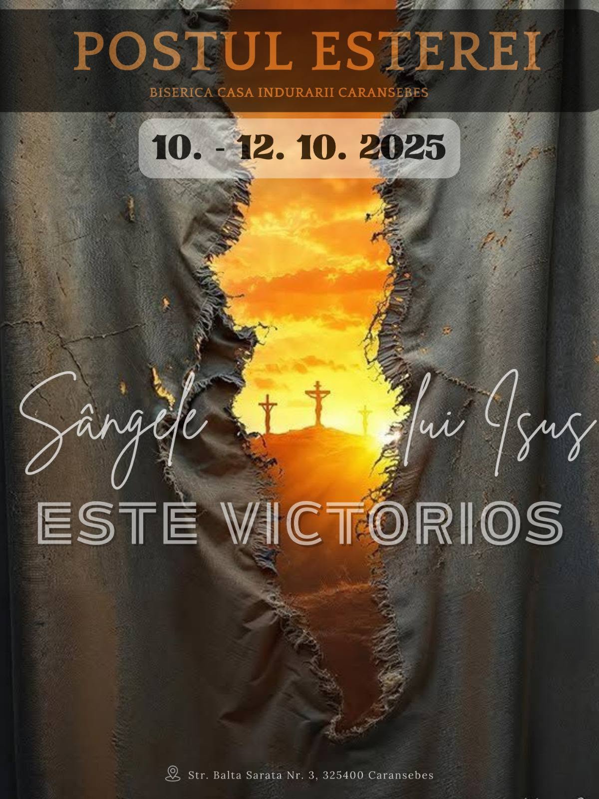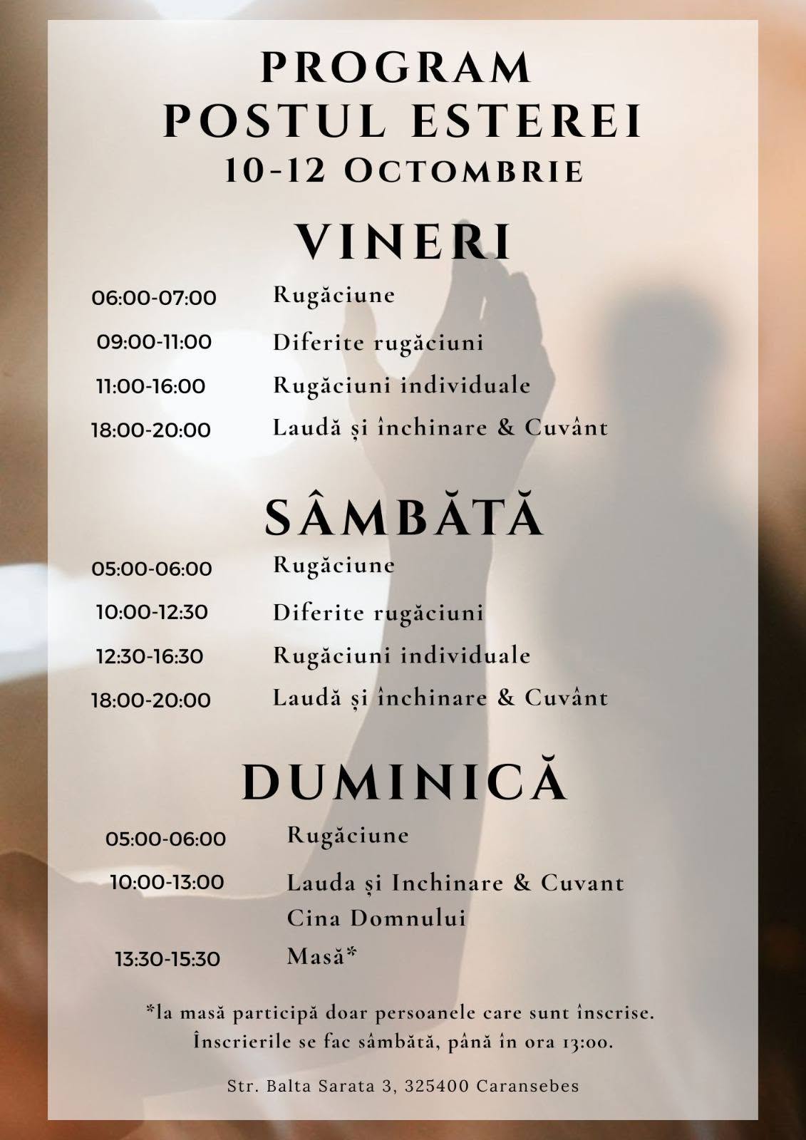 In perioada 10.10.2025–12.10.2025 vom organiza postul Esterei. Vor fi trei zile de post si rugaciune pentru vindecare si eliberare.