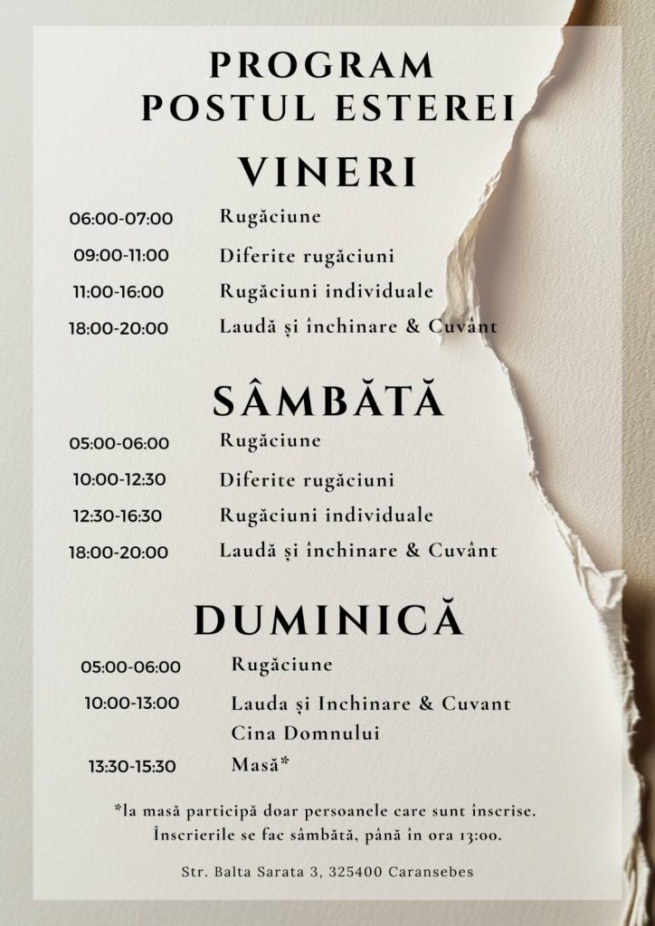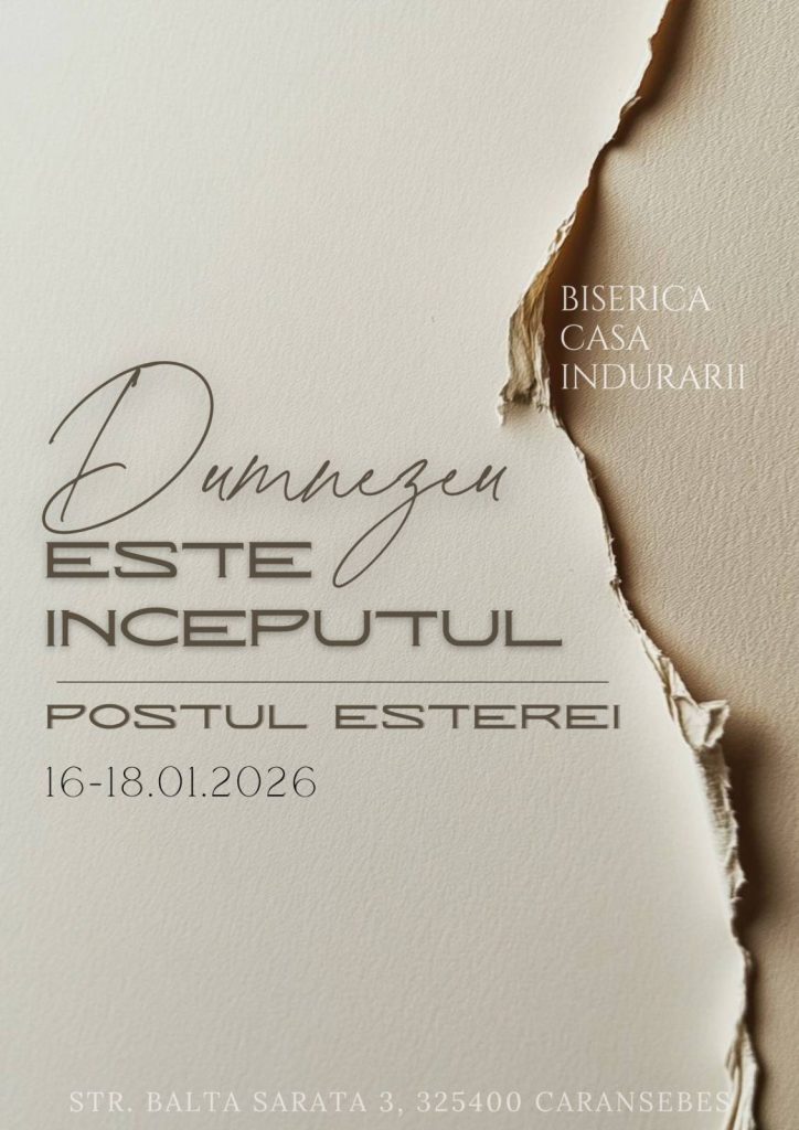 In perioada 16.01.2026–18.01.2026 vom organiza postul Esterei. Vor fi trei zile de post si rugaciune pentru vindecare si eliberare.
